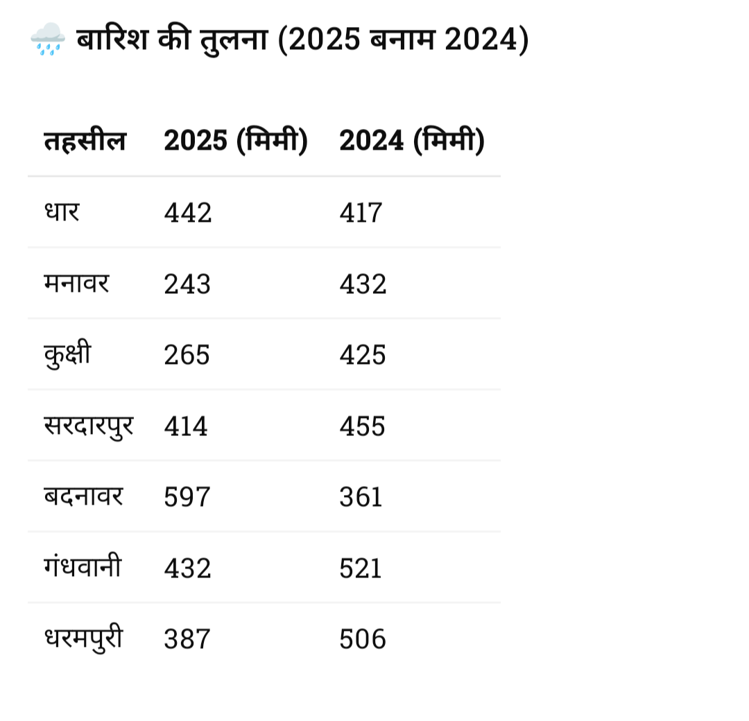 धार नगर के कुछ हिस्सों में जुलाई के आखिर में एक रात में चार इंच से ज्यादा बारिश हुई, जिससे देवीजी, मुंज सागर, दिलावरा और नटनागरा तालाबों में लगभग 50 प्रतिशत जलभराव हो चुका है। लेकिन ये राहत स्थायी नहीं मानी जा सकती, क्योंकि मानसून की स्थिरता अभी भी नहीं दिख रही।