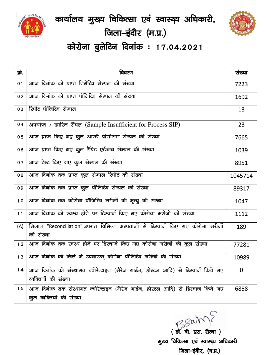 1692 नए संक्रमित, सात की मौत, जाम नगर से इंदौर पहुंची तीस टन ऑक्सीजन